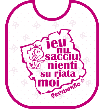 Bavetta salentina con la frase dialettale "Ieu nu sacciu nienti, su riata moi" (io non so niente, sono arrivata ora)
