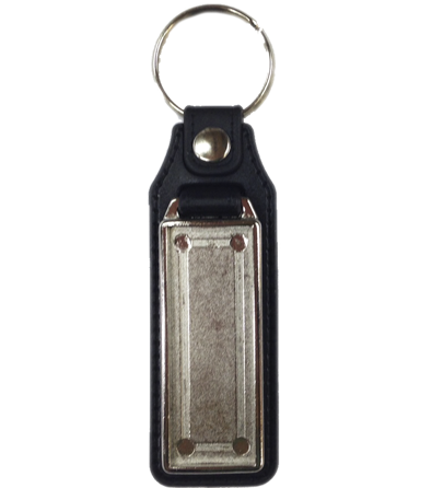 Portachiave rettangolare in metallo e retro in cuoio, stampa frontale.