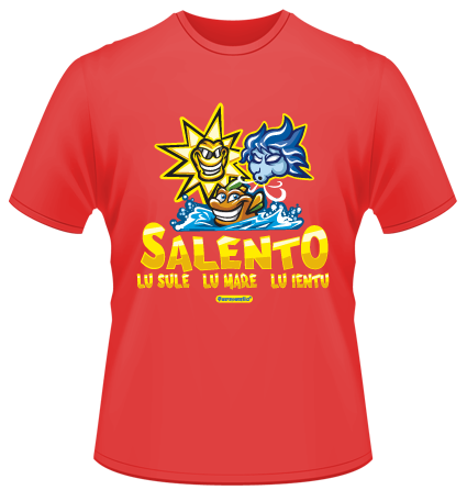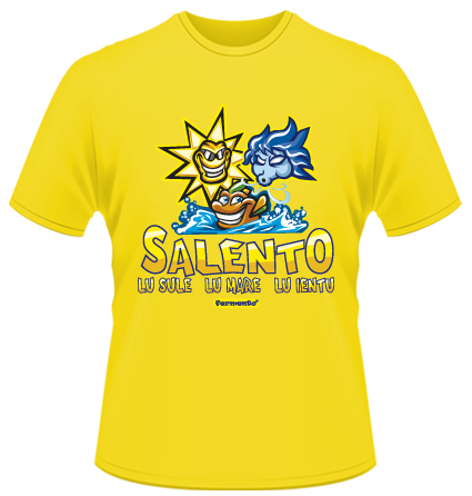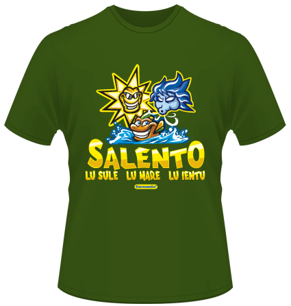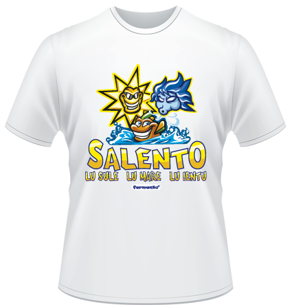 T-shirt salentina con una simpatica vignetta che rappresenta al meglio il detto popolare "Salento lu sule, lu mare, lu ientu"